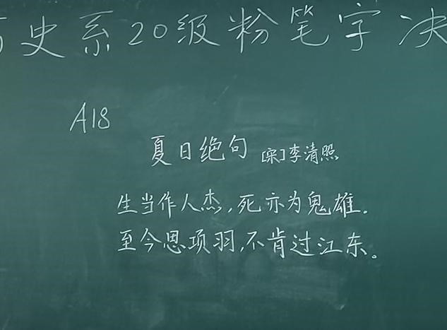 3月23日下午三点,粉笔字决赛正式开始。两班班主任凌彦老师和吕慧敏老师莅临现场作为评委参加了此次决赛。选手三人一组,轮流上讲台写粉笔字,限时10分钟。每组同学写完,评委们当场进行评分。所有选手写完后,班委快速统计分数与排名,并当场宣布排名。以下是决赛优秀作品的展示。
