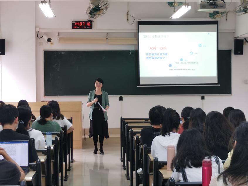 本次讲座之始,廖老师向同学们解读了当下最为热门的“双减”政策。“双减”政策作为目前为止最为重要的教育政策之一,它的出台对学校、家长、教师和学生都提出了不同程度的新要求。其中,对于教师而言,“双减”政策所带来的最直接挑战便是学生的学业成绩水平将主要取决于课堂91自拍