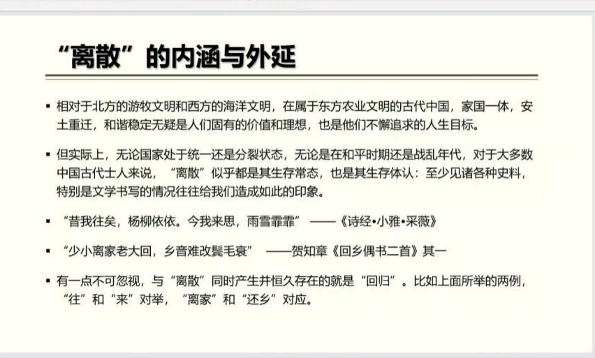 马教授首先对“离散”概念的起源、内涵与外延做了细致的梳理。“离散”一词源于希腊语,最早用例见于公元前3世纪希腊文版《旧约全书》中的犹太人“巴比伦之囚”事件,原指犹太民族被流放异地,居住祖籍国之外的生存状态。由于“离散”概念本身具有开放性,当下诸多研究对其含义做了相当程度的拓展,“离散”一词脱离了最初的宗教和种族的属性,中国古代士人的离散-回归意识完全可以纳入“离散”课题的考察范围之中。自故乡政治文化中心离散,期盼回归到故乡政治文化中心,构成了中国古代士人离散-回归意识的核心内涵。这里的“故乡”,除了故土家园之外,还具有理想、归宿或者精神家园的含义,即苏轼所说的“此心安处是吾乡”。基于此,马教授对中国古代士人“离散-回归”意识的独特内涵与独特文学书写风貌的关系进行了深入考察。