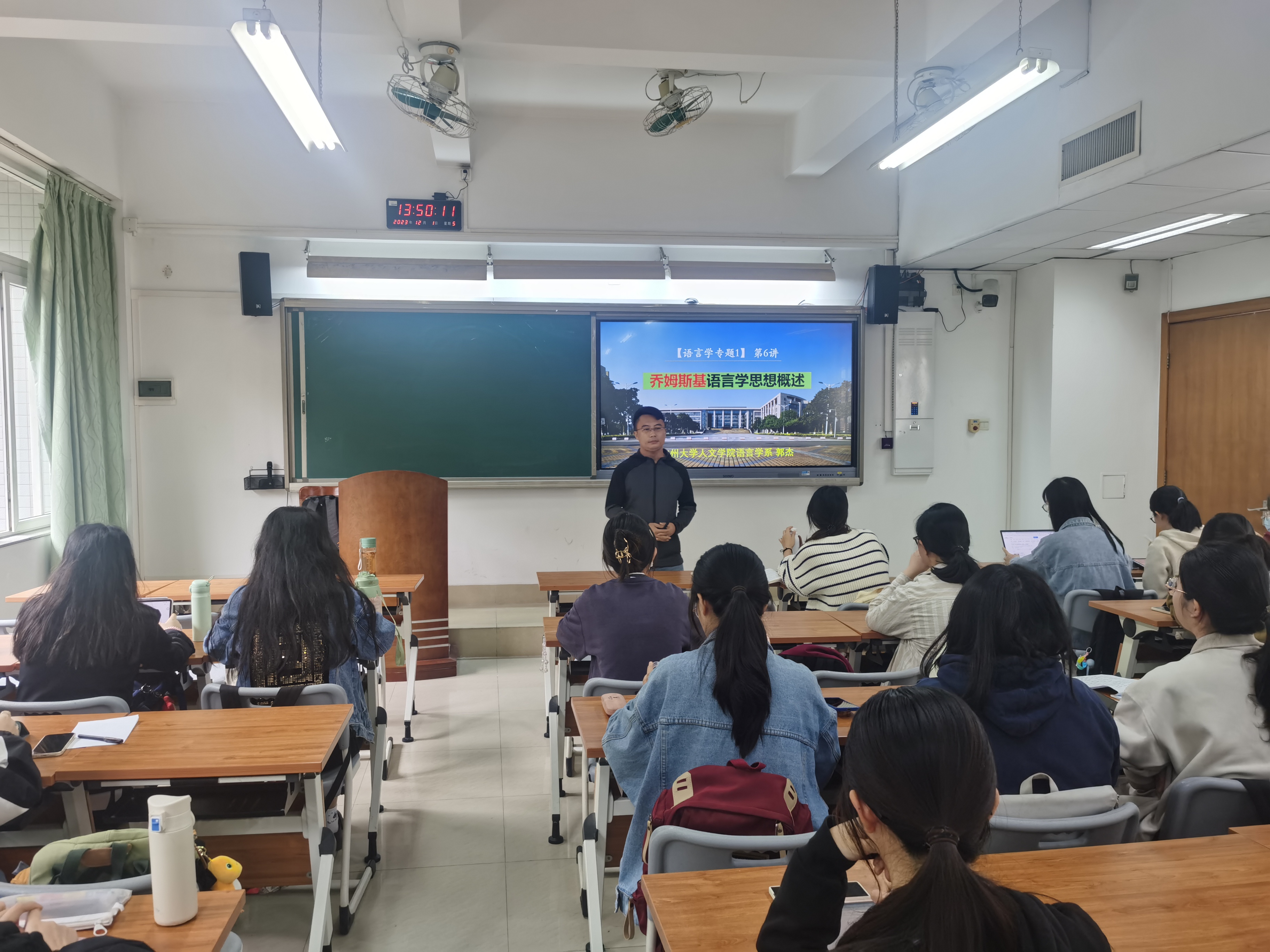 本次公开课的主题是“乔姆斯基语言学思想概述”。首先,郭老师带领大家复习了索绪尔语言学的概念与特点。面对纷繁复杂的语言学问题,以往的语言学家分别采取“做加法”“做减法”两种学科定位处理方法,从而得出“综合”意义上的语言学是一个学科群的判断;又或者经由“提纯”得出语言学的“同质性”处理的两种趋向。前者可能导致语言学沦为不同学科或领域的混沌与杂糅,后者则是“忍痛放弃异质性研究”。索绪尔采取的策略即是“做减法”,以“一切为二,两极对立,择其一”为学科划分的基本方式,分立为“语言与言语”“能指与所指”“共时与历时”“形式与实体”,使语言学变成只观照“符号形式”的“社会心理学派”。接着,郭老师指出,在索绪尔为现代语言学做好开端后,布拉格学派、哥本哈根学派、美国描写语言学派为代表的结构主义思潮兴起。其中,美国描写语言学派(博厄斯、萨丕尔、布隆菲尔德等人)的特点主要有:一是描写vs解释,即客观描写印第安语的音位和语法特点;二是个性vs共性,认为语言和语言之间的差异大于共性;三是后天vs先天,指出儿童通过后天学习而掌握语言能力。最后,郭老师举例阐释传统结构主义语法的“规定主义”“描写主义”“解释主义”等方式,进而指出乔姆斯基语言学理论对上述结构主义语言学的批判和颠覆。郭杰老师授课风格鲜明,情绪饱满、阐发学理、深入浅出,善于结合具体生活例证阐述晦涩的语言学理论,启发学生反思日常生活普遍存在的语言现象,有效增强了课堂的互动性,促进学生的掌握。