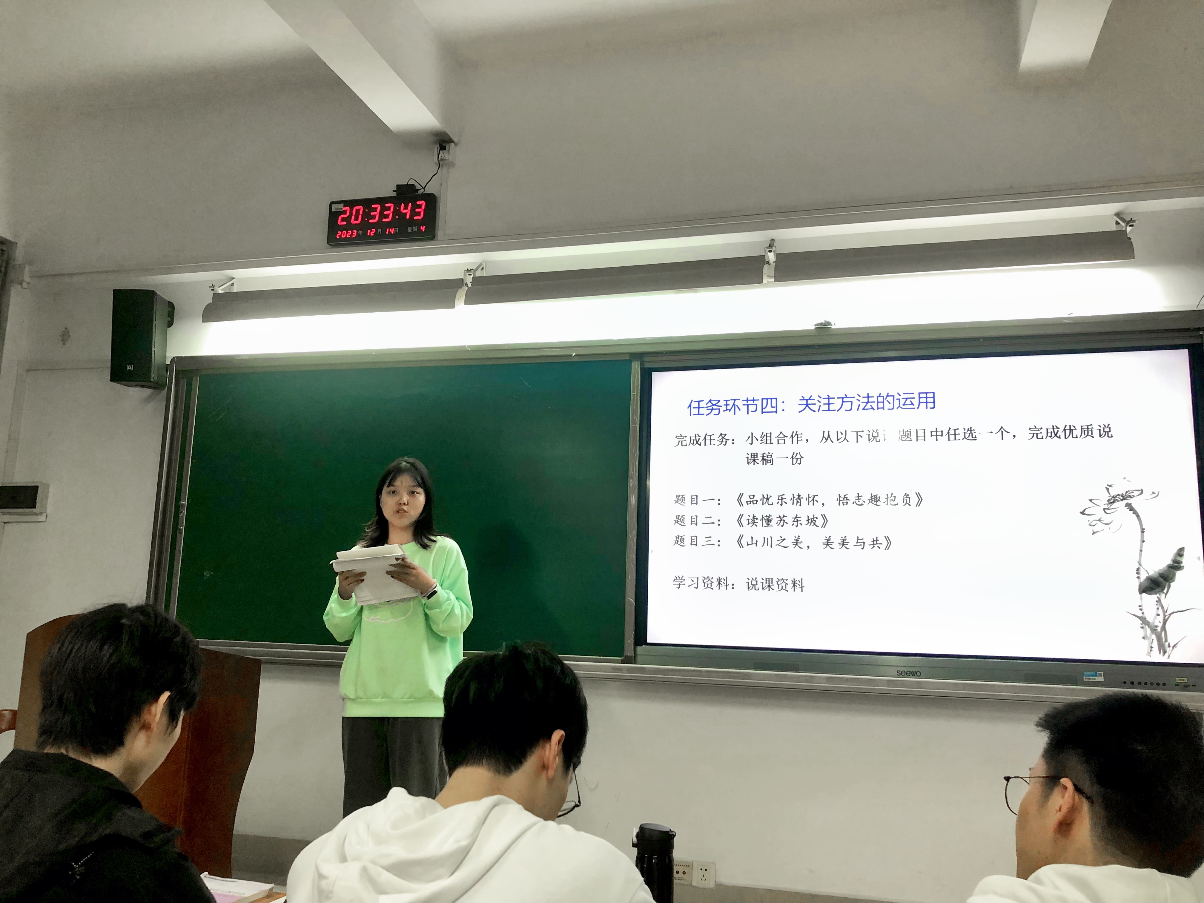 在课堂实践环节中,王珂老师引导同学们关注方法的运用,并进行限时为25分钟的小组说课准备。“模拟正式开始,同学们抓紧时间。”随着计时启动,教室里充斥着紧张的气息,现场讨论热火朝天,同学们全员参与,充分调动学习的热情,交流各种观点和想法,强化知识的实践运用。曾祥鹏、石英姿、彭茵、何俊轩四位同学代表小组上台进行分享,台下的同学针对他们的说课设计进行评议,王珂老师进行详细点评与解答。通过五个实践活动,同学们学习到了说好课的方法和策略。